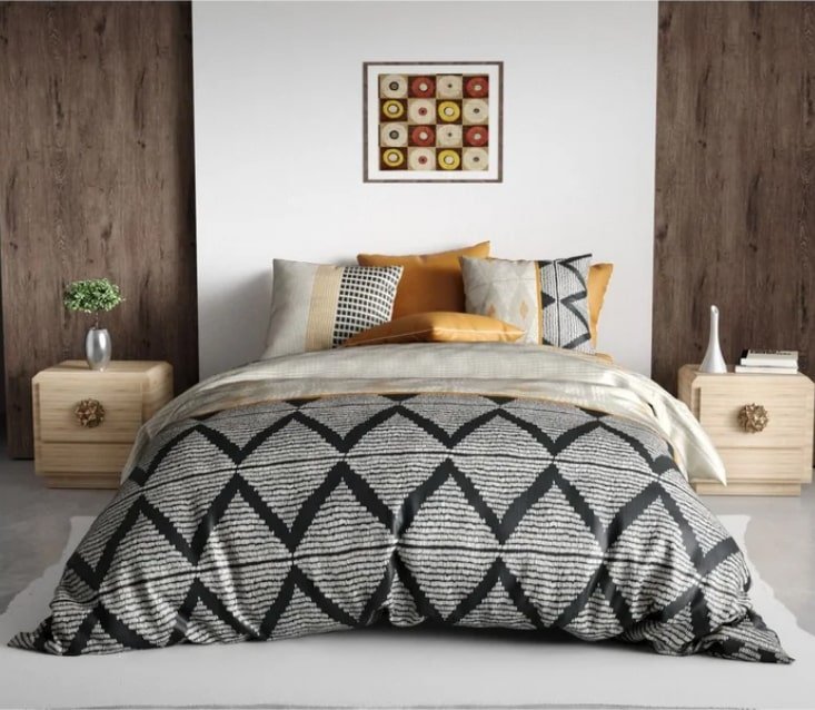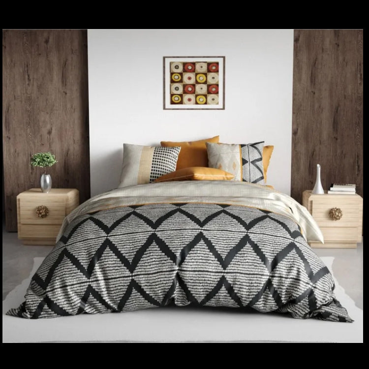 Ajoutez du caractère à votre chambre avec la parure de lit CERVIN, au motif ethnique stylisé, parfait pour une déco bohème ou contemporaine. Son tissage serré en coton assure un confort durable et un toucher agréable nuit après nuit.