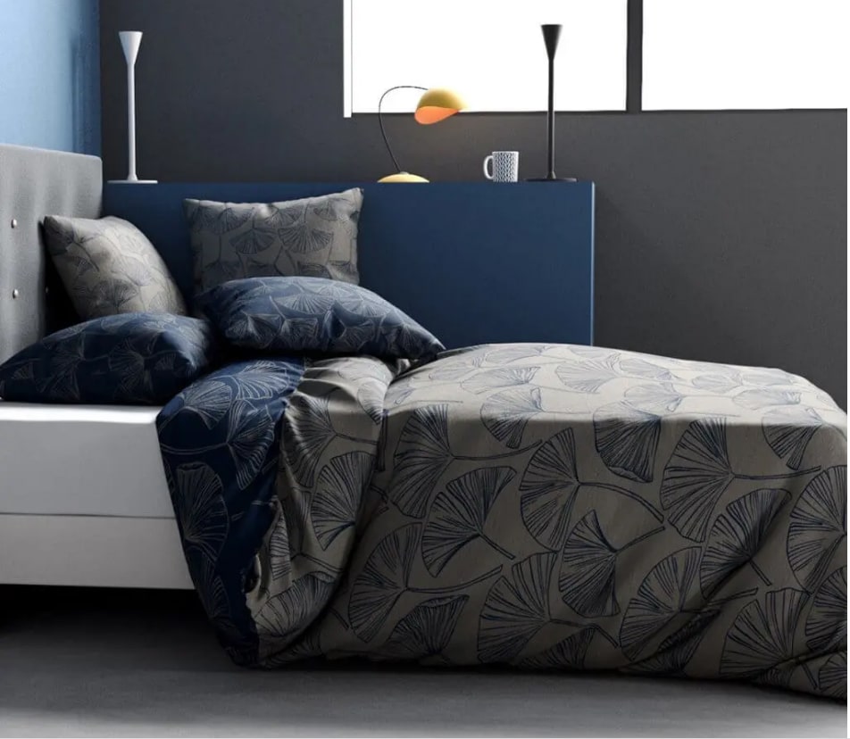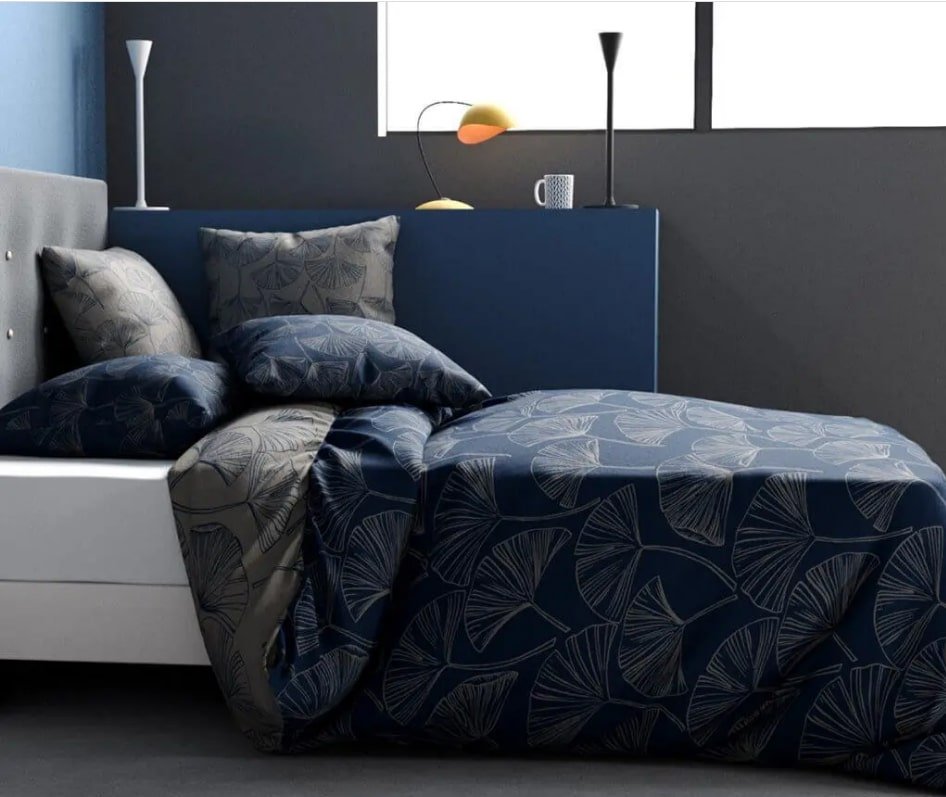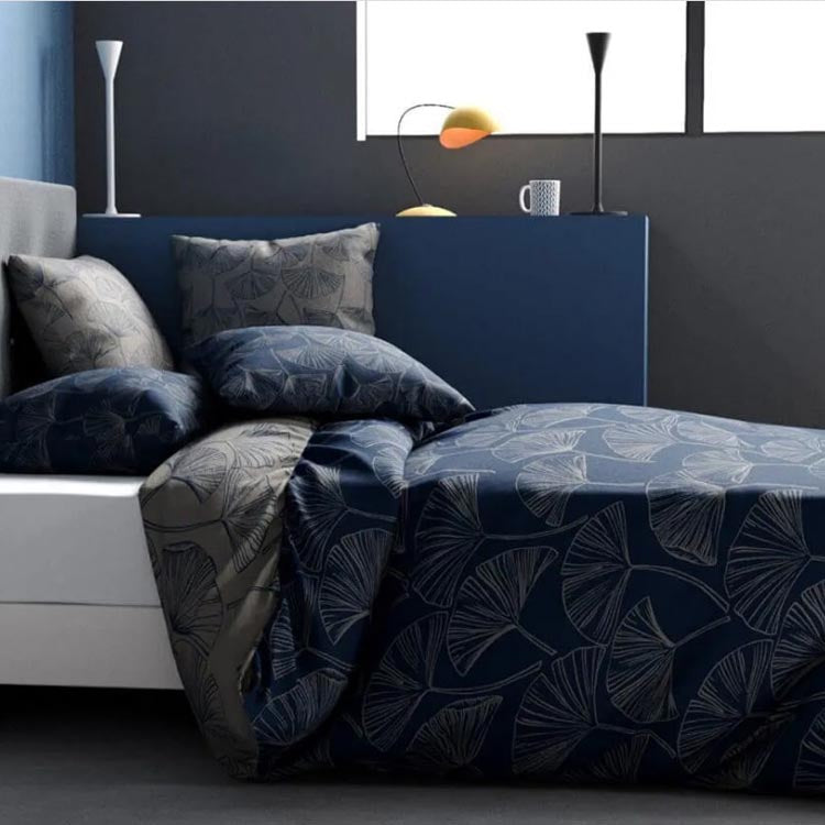 Apportez une touche de raffinement et de sérénité à votre chambre avec la parure de lit EDO. Inspirée par l'élégance japonaise, elle met en valeur un motif de fleurs de ginkgo grises délicatement posé sur un fond bleu marine profond, pour une ambiance à la fois apaisante et moderne.