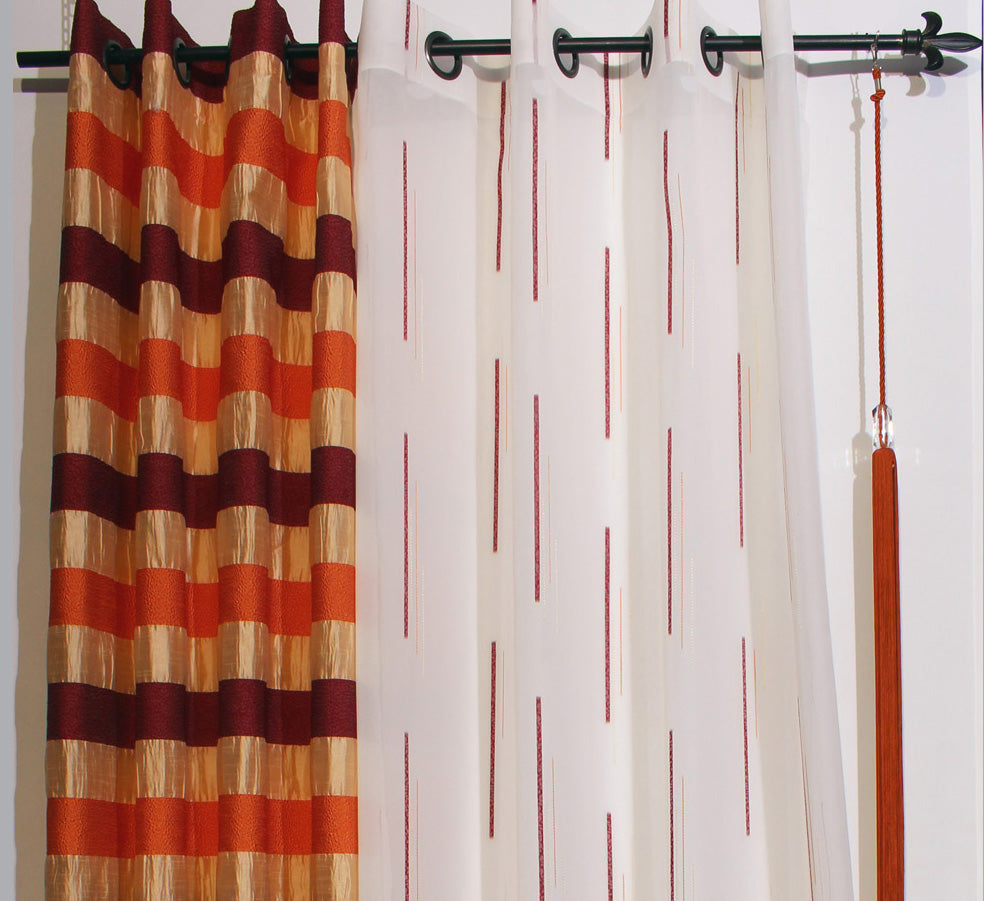 Facile à installer grâce à ses œillets métal ronds argentés, ce rideau de 140 x 260 cm habille vos fenêtres avec style et praticité. Ses rayures dans des tons bordeaux, terracotta et beige apportent chaleur et caractère à vos pièces.
