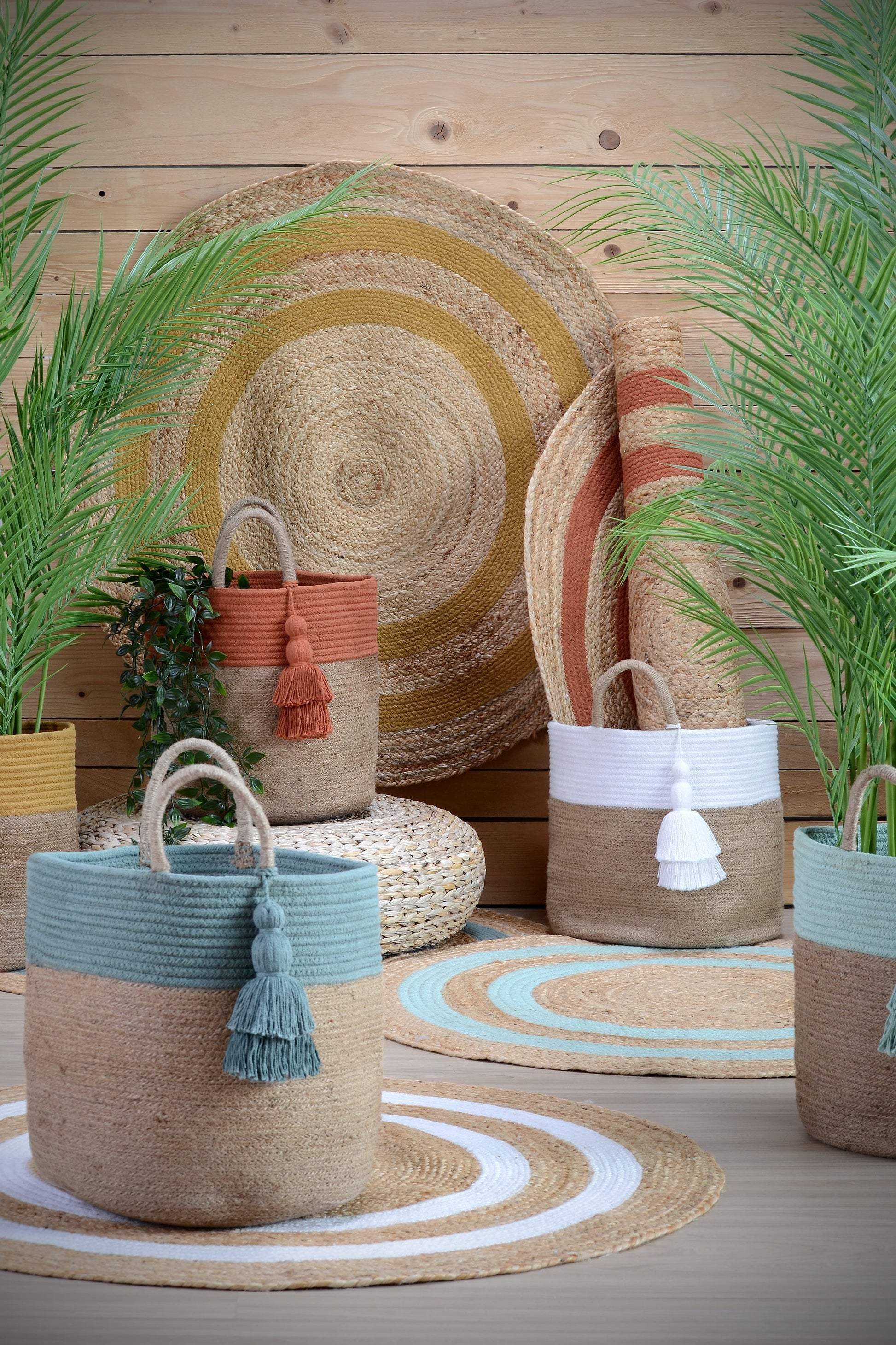Tissé à partir de fibres naturelles, ce tapis associe jute naturelle et coton pour un rendu texturé et chaleureux. Le coloris vert doux contraste subtilement avec la jute, pour une ambiance fraîche et tendance.
